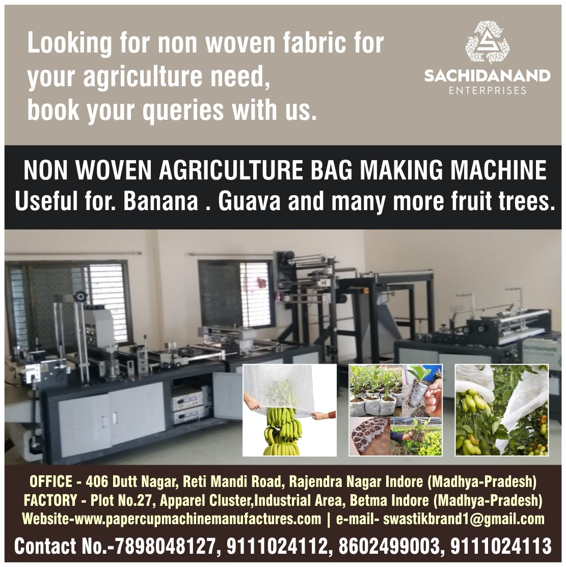 Sachidanand Enterprises, a trusted name in Indore, specializes in manufacturing high-quality non-woven agriculture bag-making machines designed to cater to modern farming needs. These advanced machines produce eco-friendly, durable bags ideal for protecting fruits like bananas, guavas, and other fruit trees from pests, sun damage, and environmental factors.