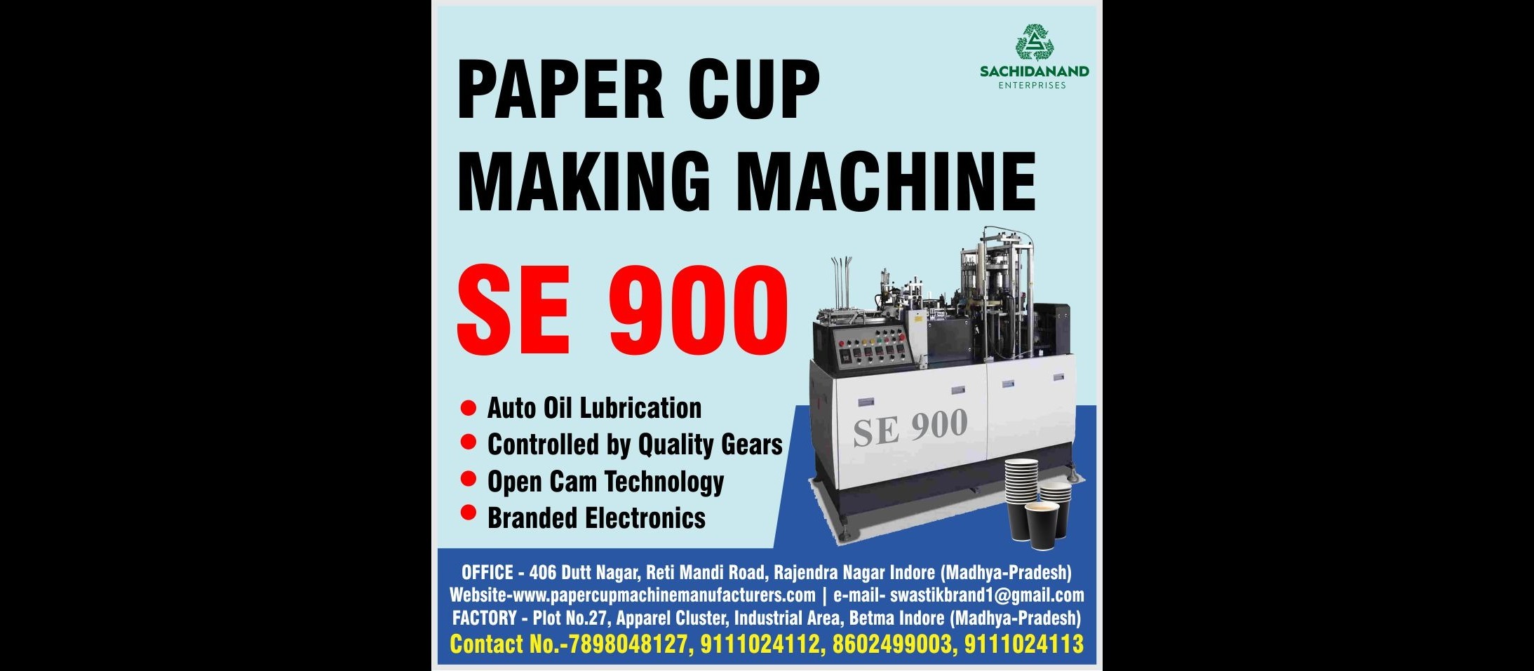 With its innovative technology, versatile production capabilities, and commitment to environmental sustainability, the bets Paper Cup Making Machine Supplier in Indore Sachidanand Enterprises is a game-changer in the paper cup manufacturing industry. Whether you're a small-scale startup or a large-scale production facility, our machine offers a reliable and cost-effective solution for meeting the growing demand for eco-friendly disposable cups. Contact us today to know more.