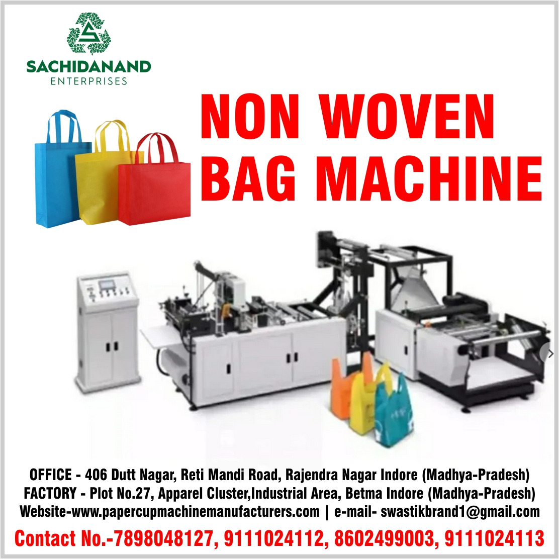 नॉन वोवन बैग बनाने की मशीन | Non Woven Box Bag Making Machine | Non Woven Box Bag Business | Multifunctional Non Woven Box Bag Making Machine | Double Liner Non Woven Bag Cutting & Sewing Machine | Woven Sack Making Machine | Sachindand Enterprises Importer of Multifunctional Non Woven Box Bag Making Machine In Indore, Madhya Pradesh, India. Sachidanand Enterprises is leading supplier of Double Liner Non Woven Box Bag Making Machine and also for woven bag production, mesh bag making machine for garlic, onion, potato, coconut packing, leno bag making machine, jumbo bag making machine and many more. Our all products range include:- high-speed, middle-speed and economic type Sachidanand Enterprises is well recognized manufacturer, wholesaler, importer & supplier of Liner Woven Box Bag making machine. We are top choice for your search of Liner Woven Bag manufacturing machine Liner Woven Bag cutting machine, Liner Woven Bag making machine price to buy best quality machine with good service in best price Liner Woven Bag stitching machine, woven bag business, woven bags manufacturing plant, So why are you waiting??? Call now to book machine or for more details.