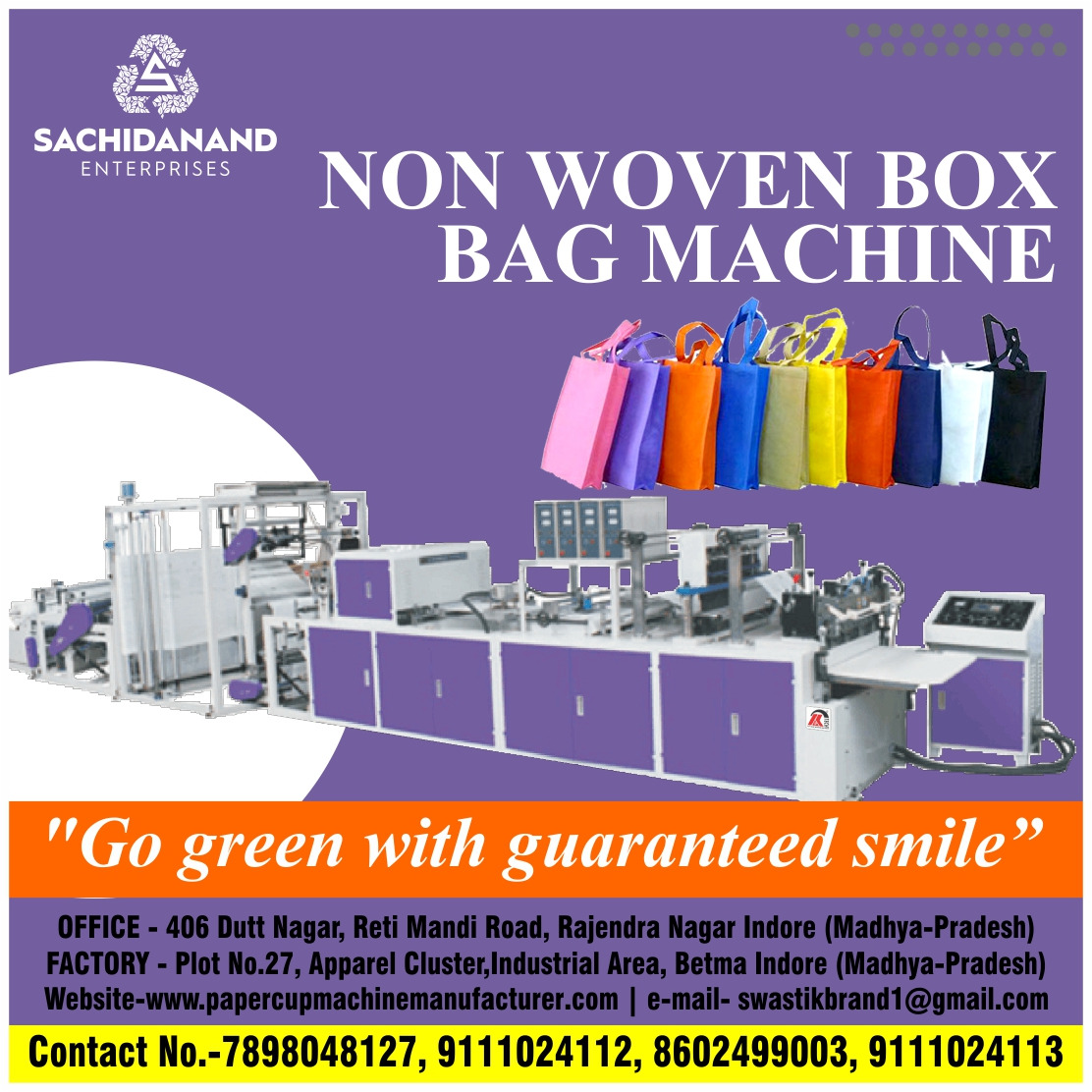 Sachidanand Enterprises is leading supplier of Double Liner Non Woven Bag Making Machine and also for woven bag production, mesh bag making machine for garlic, onion, potato, coconut packing, leno bag making machine, jumbo bag making machine and many more.