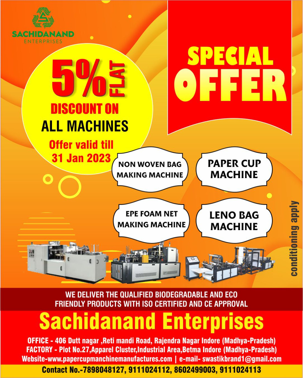 specialfestivaloffer ** 5% off On Non Woven Bag Machinery, Leno Bag Machine, EPFO Machine and Paper Cup Making Machine at Sachidanand Enterprises **