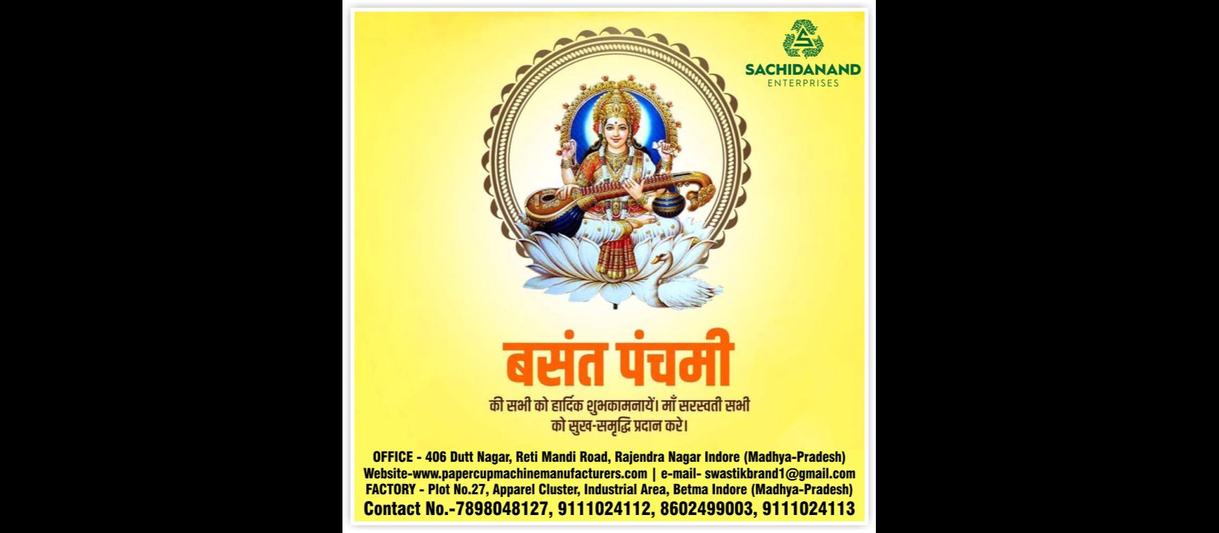 मां सरस्वती आपके घर में अपार खुशियां और प्यार लेकर आएं। सच्चिदानंद इंटरप्राइजेज के और से आप सभी को बसंत पंचमी की हार्दिक शुभकामनाएं। हैप्पी बसंत पंचमी!