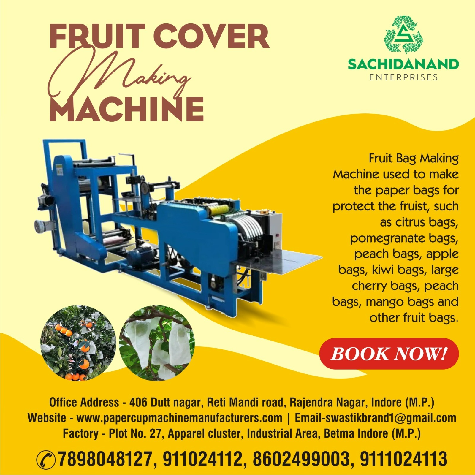 Sachidanand Enterprises supplies high-performance fruit cover making machines designed for consistent output and long-lasting covers. Ideal for pomegranate, apple, mango, and other fruit crops, these machines help protect fruits from pests, sunburn, and weather damage.